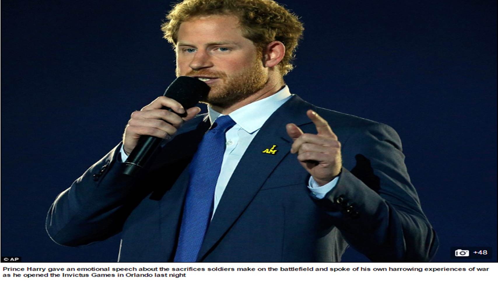 Prince Harry gave an emotional speech about the sacrifices soldiers make on the battlefield and spoke of his own harrowing experiences of war as he opened the Invictus Games in Orlando last night.