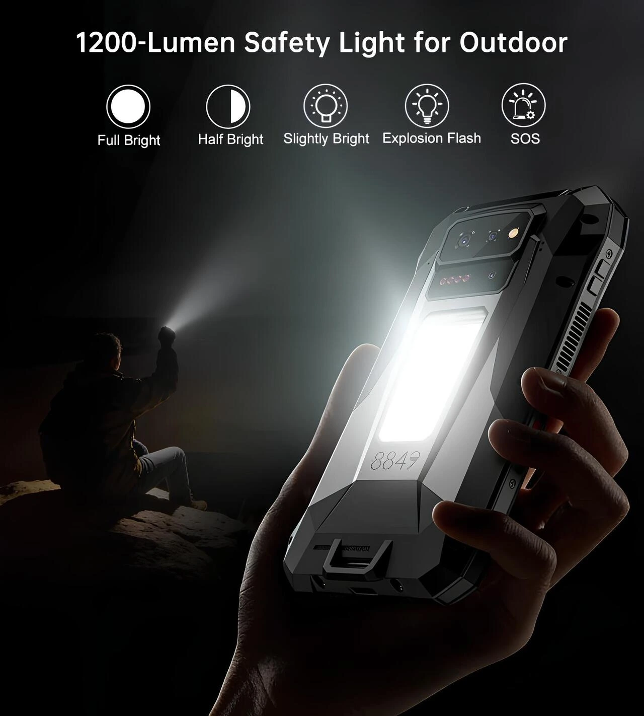 8849 Tank X 5G’nin 1200 lümen yüksek parlaklıklı kamp ve güvenlik ışığı, tam parlaklık, yarım parlaklık, düşük parlaklık, flaş ve SOS modlarını gösteren tanıtım görseli.