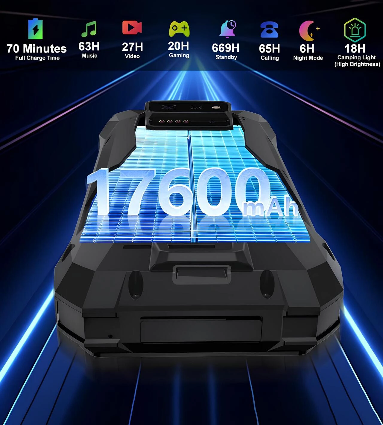 8849 Tank X 5G’nin 17.600 mAh yüksek kapasiteli bataryası ve 70 dakika tam şarj, 63 saat müzik, 27 saat video, 20 saat oyun, 669 saat bekleme, 65 saat konuşma performansını gösteren tanıtım görseli.