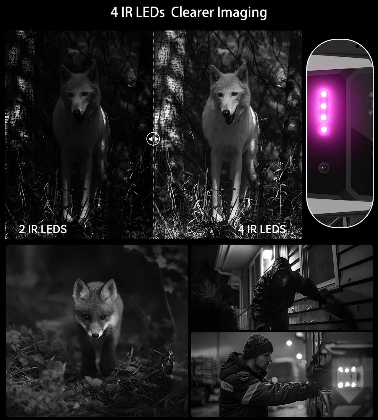 8849 Tank X 5G’nin 4 IR LED destekli 64 MP gece görüş kamerası ile 2 IR LED’e kıyasla daha net ve aydınlık siyah-beyaz görüntü performansını gösteren karşılaştırmalı tanıtım görseli.