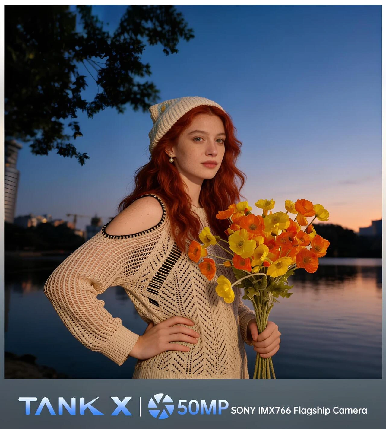 8849 Tank X 5G’nin 50 MP ön kamera selfie performansı ve 8 MP telefoto kamerası ile detaylı yakın çekim örneğini gösteren tanıtım görseli.
