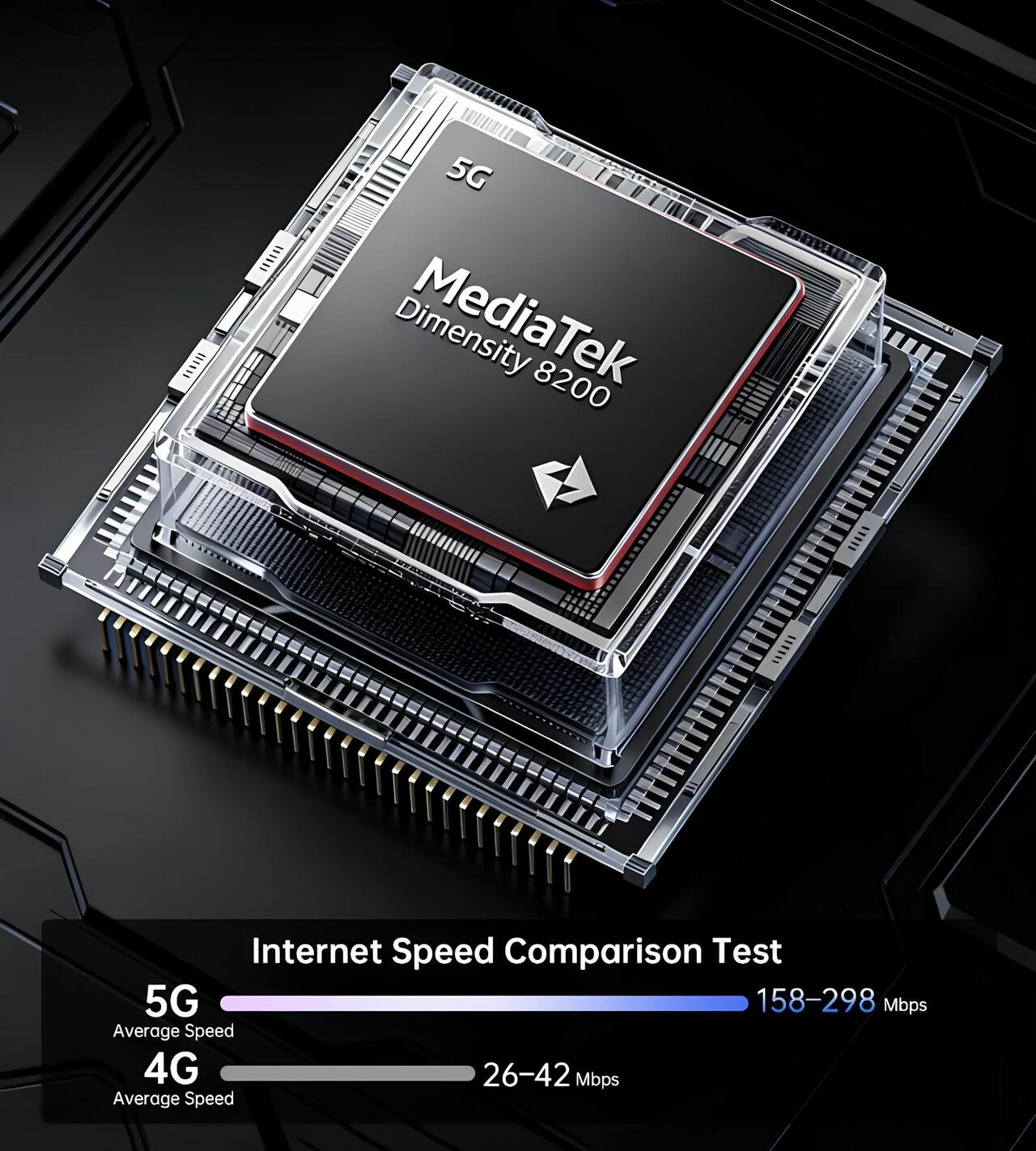 8849 Tank X 5G’nin MediaTek Dimensity 8200 işlemcisi ile 5G bağlantıda 158–298 Mbps ve 4G’de 26–42 Mbps ortalama hız karşılaştırmasını gösteren performans görseli.