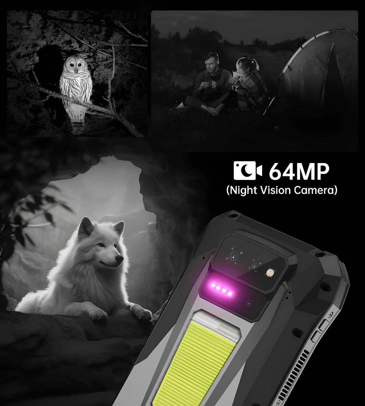 8849 Tank X 5G’nin 64 MP gece görüş kamerası ve IR LED desteği ile karanlık ortamda net siyah-beyaz çekim performansını gösteren tanıtım görseli.