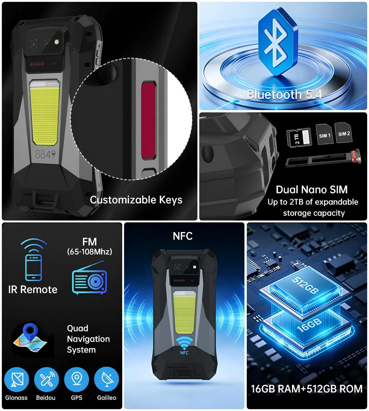 8849 Tank X 5G’nin özelleştirilebilir tuşları, Bluetooth 5.4, çift nano SIM, NFC, IR uzaktan kumanda, FM radyo ve 16 GB RAM + 512 GB depolama özelliklerini gösteren tanıtım görseli.