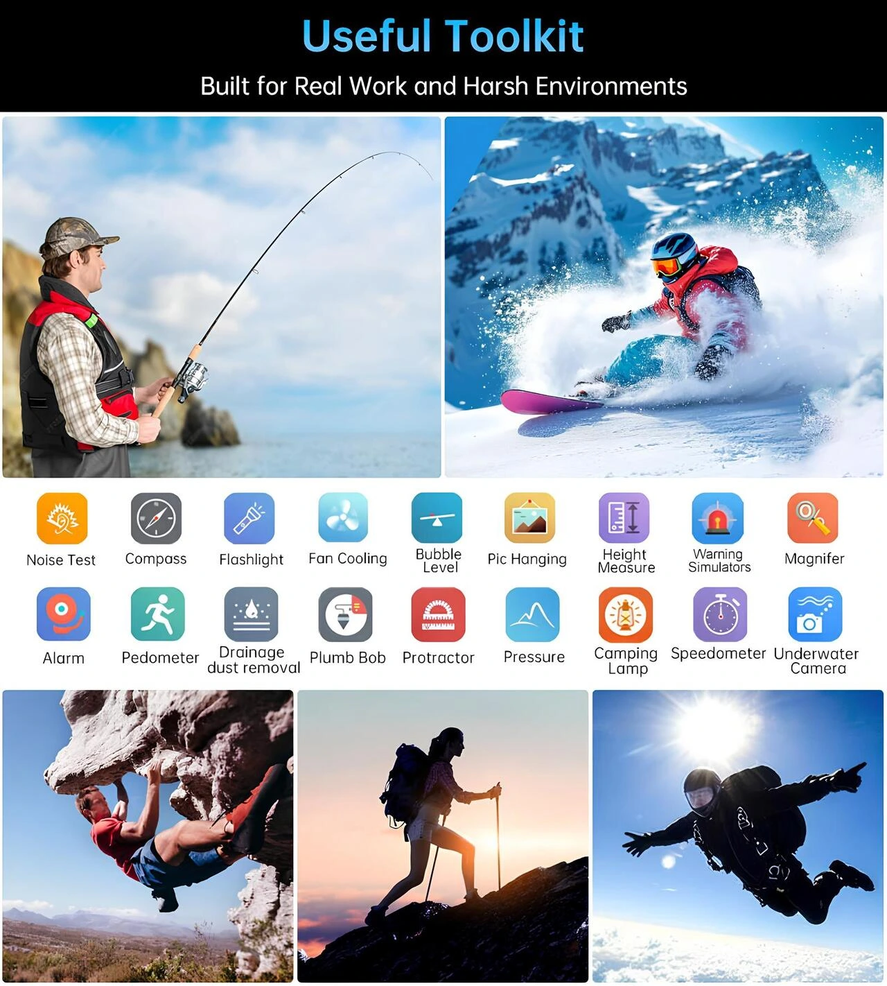8849 TANK X Dayanıklı 5G akıllı telefon, dayanıklı bir telefondan çok daha fazlası; gerçek dünya kullanımına yönelik tasarlanmış pratik, hepsi bir arada bir araçtır. Sistem düzeyinde bir Araç Kutusu ile donatılmış olan bu telefon, pusula, el feneri, kamp lambası, su terazisi, şakül, iletki, yükseklik ölçümü, barometre, hız göstergesi, büyüteç, adımsayar, su altı kamerası, gürültü testi ve alarm uyarıları gibi temel işlevleri entegre eder. Bu araçlar, açık hava keşifleri, inşaat işleri, ekipman kurulumu, mühendislik denetimi ve acil durumlar için tasarlanmıştır. Sinyal olmayan alanlarda navigasyon yaparken, gece çalışırken, sahada tesviye veya ölçüm yaparken, su altı kontrolleri gerçekleştirirken veya çevresel koşulları izlerken, TANK X ek ekipman ihtiyacını azaltır ve zorlu ortamlarda verimliliği ve güvenilirliği artırır.
