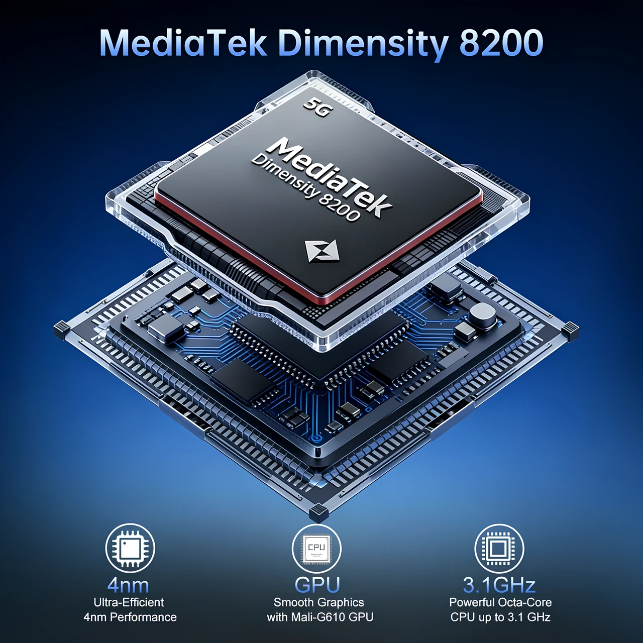 MediaTek Dimensity 8200, günlük görevler ve oyunlar için hızlı ve akıcı performans sunarken, daha uzun pil ömrü için güç tüketimini optimize etmek üzere tasarlanmış ultra verimli 4nm sekiz çekirdekli bir çiptir.
