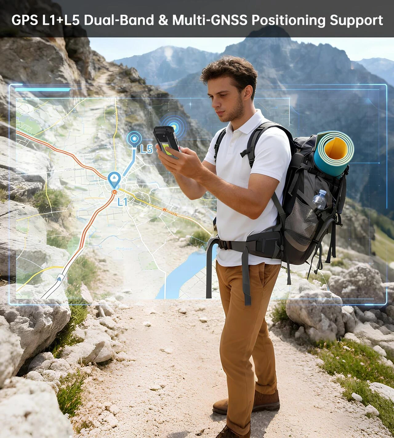 8849 Tank X 5G’nin GPS L1+L5 çift bant ve multi-GNSS konumlama desteği ile dağlık arazide hassas ve stabil navigasyon performansını gösteren tanıtım görseli.