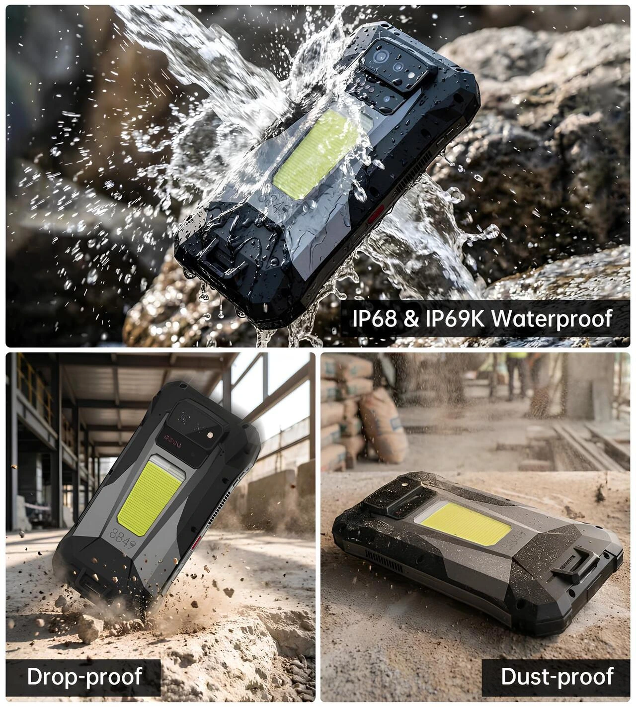 8849 Tank X 5G’nin IP68 ve IP69K suya dayanıklılık, darbe ve toza karşı koruma özelliklerini gösteren sağlamlık test tanıtım görseli.