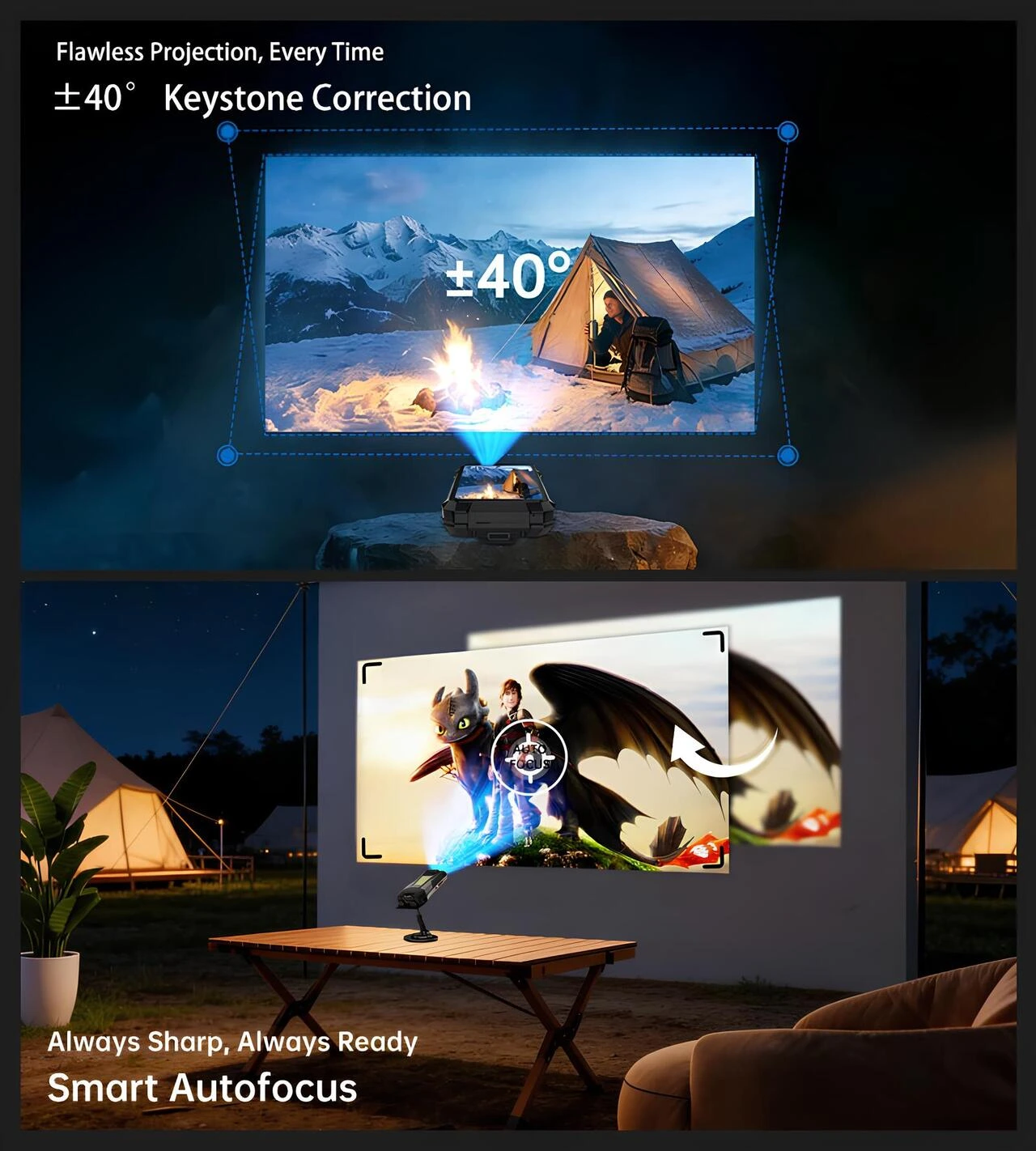 Bu dahili projektör, 0,5 m ile 3,0 m arasında lazer tabanlı otomatik odaklama özelliğine sahiptir, böylece manuel olarak odak ayarlamanıza gerek kalmadan görüntüyü hızlı ve doğru bir şekilde netleştirir. Geniş ±40° trapez düzeltme özelliği, telefon mükemmel düz olmasa bile projeksiyonu düz bir yüzeye hizalamanıza olanak tanıyarak, düzensiz kurulumlarda bile görüntülerin dikdörtgen ve bozulma olmadan kalmasını sağlar. Bu özellikler bir araya gelerek, kamp çadırlarında, toplantı odalarında, dış duvarlarda veya saha ortamlarında net ve doğru hizalanmış bir projeksiyon elde etmeyi kolaylaştırır, zamandan ve emekten tasarruf sağlar.