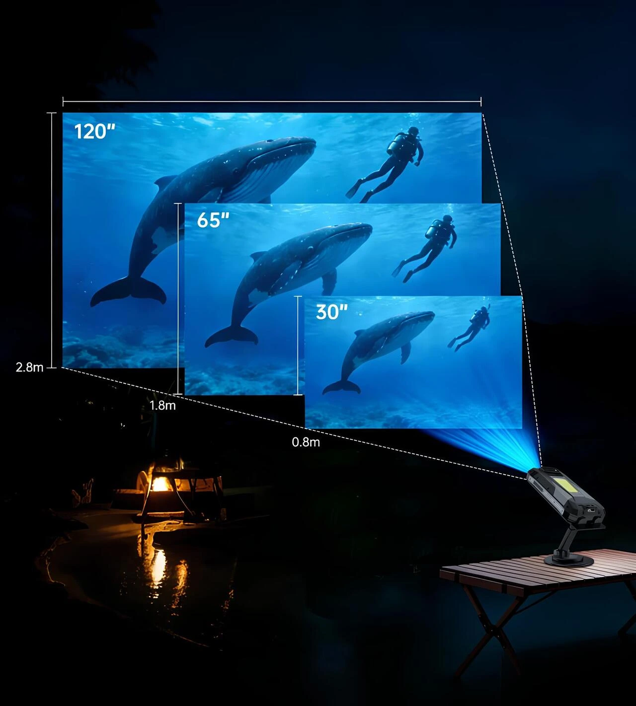 8849 Tank X 5G modelinin dahili projeksiyon özelliği ile 0,8 m, 1,8 m ve 2,8 m mesafelerde 30 inç, 65 inç ve 120 inç görüntü boyutlarını yansıtma kapasitesini gösteren kullanım görseli.