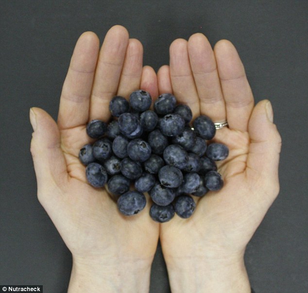 An 80g five-a-day portion of small fruit such as blueberries (or larger fruit cut up in a fruit salad) is roughly what you can fit into your cupped hands.