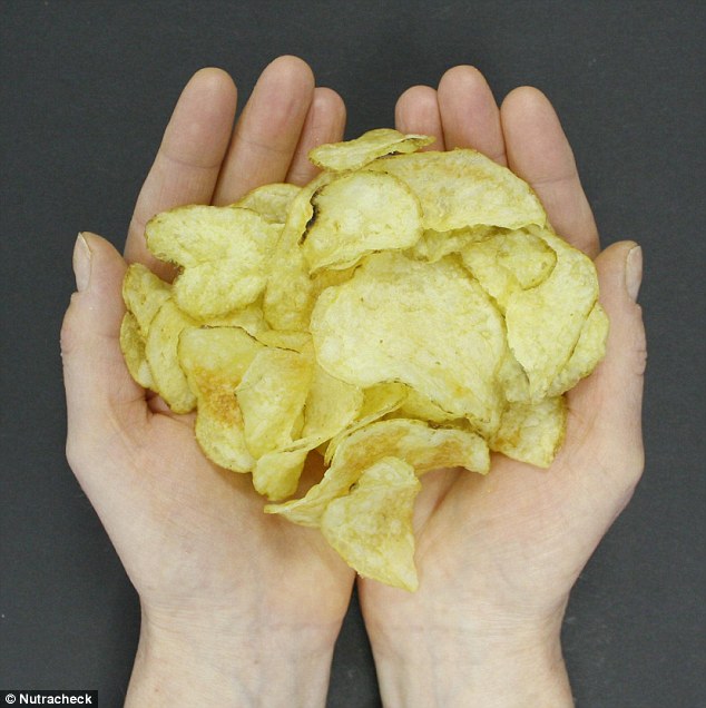 A portion of crisps is 30g, roughly equal to a normal packet of crisps, which contains 153 calories and 7.6g of fat