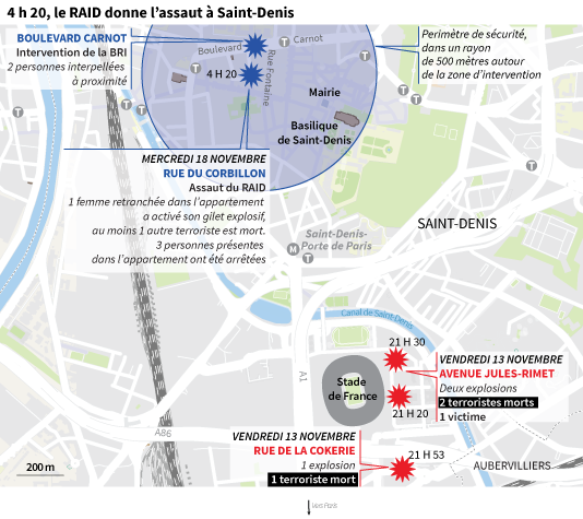Deux personnes liées aux attentats du 13 novembre sont mortes et huit autres ont été interpellées lors d’un assaut lancé à l’aube mercredi à Saint-Denis. L’opération antiterroriste, menée par la sous-direction antiterroriste de la police judiciaire, le RAID (Recherche, assistance, intervention, dissuasion) et la BRI (brigade de recherche et d’intervention), visait l’instigateur présumé des attentats, Abdelhamid Abaaoud. Mais ni lui ni Salah Abdeslam, un auteur présumé des attaques actuellement en fuite, ne figurent parmi « les gardés à vue », a précisé François Molins, le procureur de la République de Paris, mercredi soir.