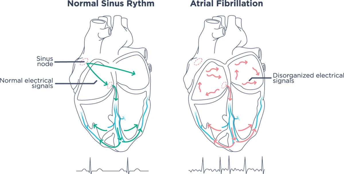 Atriyal fibrilasyon (AFib), kalbin elektriksel aktivitesinde bir anormalliktir. Normalde kalp, kan pompalamak için elektriksel uyarılara dayalı olarak düzenli bir atışla kasılır ve rahatlar. Bu sinyaller sağ atriyumdaki sinüs düğümünden başlar.