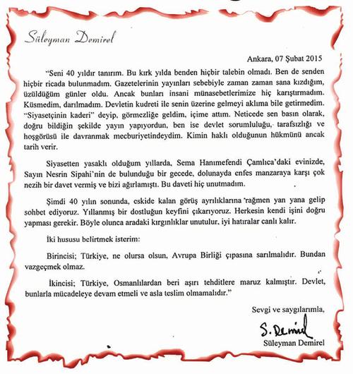 Konuşmanızda Dokuzuncu Cumhurbaşkanımız rahmetli Süleyman Demirel’e de bu yönde sözler sarf ettiğimi öne sürüyorsunuz. Madem doğup büyüdüğümüz yerler bizim şahidimiz oluyor, o zaman ben de İslamköylü Süleyman Demirel’in vefatından beş ay önce bana gönderdiği bir mektupta şahsımla ilgili söylediği şu sözleri sizin ve milletimizin takdirine sunuyorum: