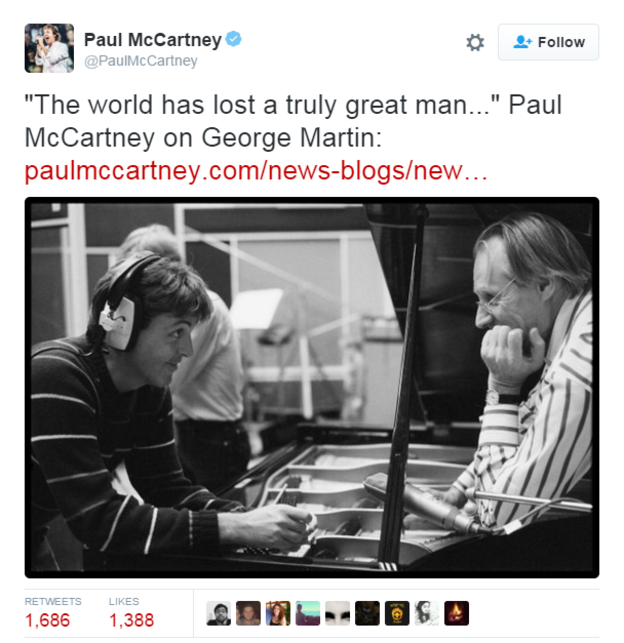 Beatles grubu üyesi Paul McCartney de internet sitesinden ve Twitter hesabından yaptığı açıklamada Sir George Martin için “ikinci babam” dedi.
