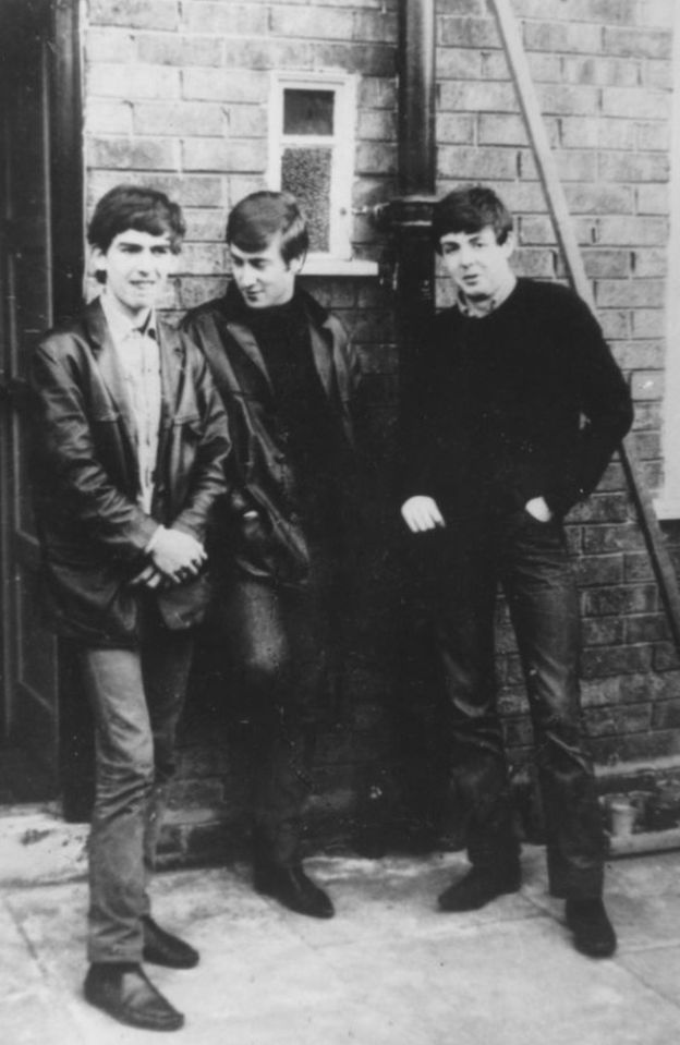 - John Lennon, George Harrison ve Paul McCartney ile beraber. Bu fotoğraf, McCartney’in Liverpool’daki evinin dışında 1960 yılında çekildi. Ringo Starr gruba iki sonra katıldı.
