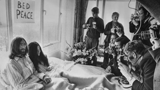 - 1969’da çekilen bu fotoğrafta John Lennon ve eşi Yoko Ono, Amsterdam’daki Hilton Hotel’de yataktan yedi gün çıkmayarak ‘dünyadaki savaş ve şiddet karşıtı’ protesto eylemi düzenlemişti.
