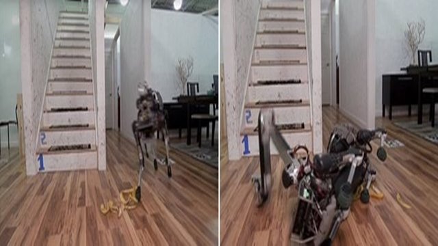 In another scene in the video, the robot is shown falling on a banana skin – and getting back up.