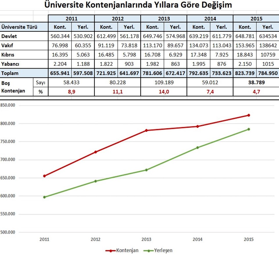 Nişantaşı Üniversitesi ArGe Merkezi tarafından yapılan çalışmaya göre en fazla kontenjan açığının olduğu yıl ise 2013’tü. 781 bin 606 boş kontenjana yalnızca 627 bin 417 aday yerleşmiş, 109 bin 189 kontenjan açıkta kalmıştı. 2013’te yüzde 14 olan boş kontenjan oranı 2014’te yüzde 7.4’e indi. Boş kontenjanların çokluğu yerleşemeyen öğrenciler için sevindirici olsa da bu kontenjanlar üniversiteler için atıl kalan kapasite anlamı taşıyor.