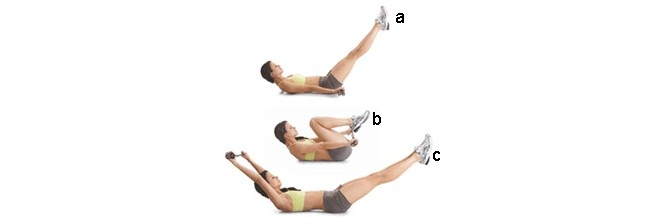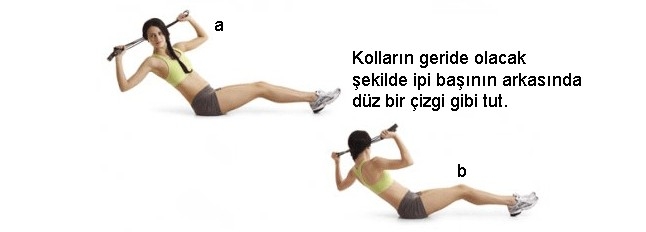 Ellerin kalçanın iki yanında olacak şekilde, ipi kalçanın altından, yerden birkaç santim yukarıda tut. Kolların düz olmalı. Karın kaslarından güç alarak omuzlarını yerden kaldır ve ellerinle 10 küçük itiş yap (a). Dizlerini göğsüne doğru çek ve ipi ayaklarının altına getir (b), sonra kollarını başının üzerine, bacaklarını da düz olarak öne uzat (c) Kollarını kulaklarının arkasına doğru hareket ettirerek 10 küçük itiş yap. Başlangıç pozisyonuna dönmek için hareketi tersten yap. Bunu bir tekrar olarak düşün. Beş defa yap (toplamda 100 itiş).