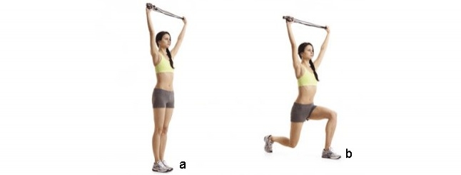 İpi iki elinle başının üzerinde gergin bir şekilde tut (a). Sol ayağınla ileri doğru adım at ve dizini bükerek her iki dizinle 90 derecelik açı oluşturuncaya kadar lunge pozisyonuna alçal (b). 10 defa üç santim kadar yavaşça yükselip alçal, ardından sol topuğunu iterek başlangıç pozisyonuna dön. Bunu bir tekrar olarak düşün. Sağ bacağınla tekrarla ve yönünü değiştirerek bir dakika boyunca devam et.
