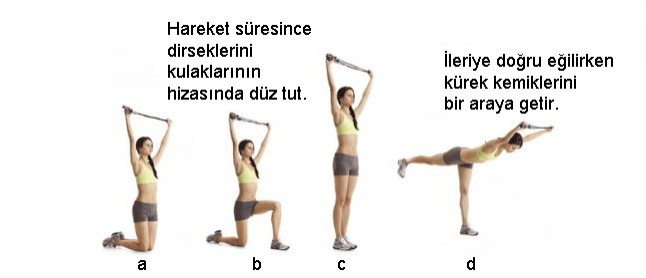 Yere diz çök ve dizlerini birleştir. Vücudunun şekli 90 derecelik açı oluşturmalı. Kollarını başının üzerinde düz uzatıp, ipi iki elinle gergin bir şekilde tut (a). Üst gövdenin pozisyonunu koru, karın kaslarından güç alarak sol ayağını ileri doğru uzat ve yere koyup lunge pozisyonuna geç (b), ardından sol topuğunu iterek ayağa kalk (c). Bir kerede sol bacağını düz şekilde arkaya uzat ve gövdenle yere doğru alçal. Vücudun T şekline gelinceye kadar sırtını düz tutarak kollarını başının üzerine uzat (d). Üç saniye boyunca bu pozisyonda kal, başlangıç pozisyonuna dönmek için hareketi tersten yap. Diğer bacağınla tekrar et. Her iki tarafta 10 tekrar yapacak şekilde değiştirerek devam et.