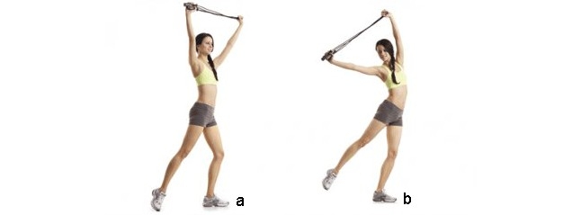 Dizini hafifçe bükerek sol bacağının üzerinde dur, sağ bacağını çapraz şekilde arkaya uzatarak parmak ucunu yere değdir. İpi her iki elinle başının üzerinde gergin bir şekilde tut, kolların düz olmalı (a). Kalça kaslarını sıkarak sağ bacağını yavaşça yerden kaldır. Sağ ayağının parmak ucuna değmeye çalışıyormuş gibi kollarını yana ve yukarıya doğru uzat (b). Dur, başlangıç pozisyonuna dön. Bunu bir tekrar olarak düşün. 50 defa yap, sonra diğer tarafta tekrarla.