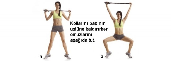 Parmak uçların dışa dönük olarak, ayaklarını 90 santim genişlikte açıp dur. İpi başının arkasında gergin şekilde tutarak parmak uçlarının üstünde yüksel. Omuzlarının üzerinde bir barı tutuyormuş gibi düşün (a). Dizlerini büküp geriye oturur gibi squat pozisyonuna alçal, kollarını başının üzerine it (b). Dur, kürek kemiklerini aşağı doğru çekip bir araya getir. Başlangıç pozisyonuna dönmek için bacaklarını düzelt. Bunu bir tekrar olarak düşün. 25 tekrarla başla, sonra 50 tekrara çık.
