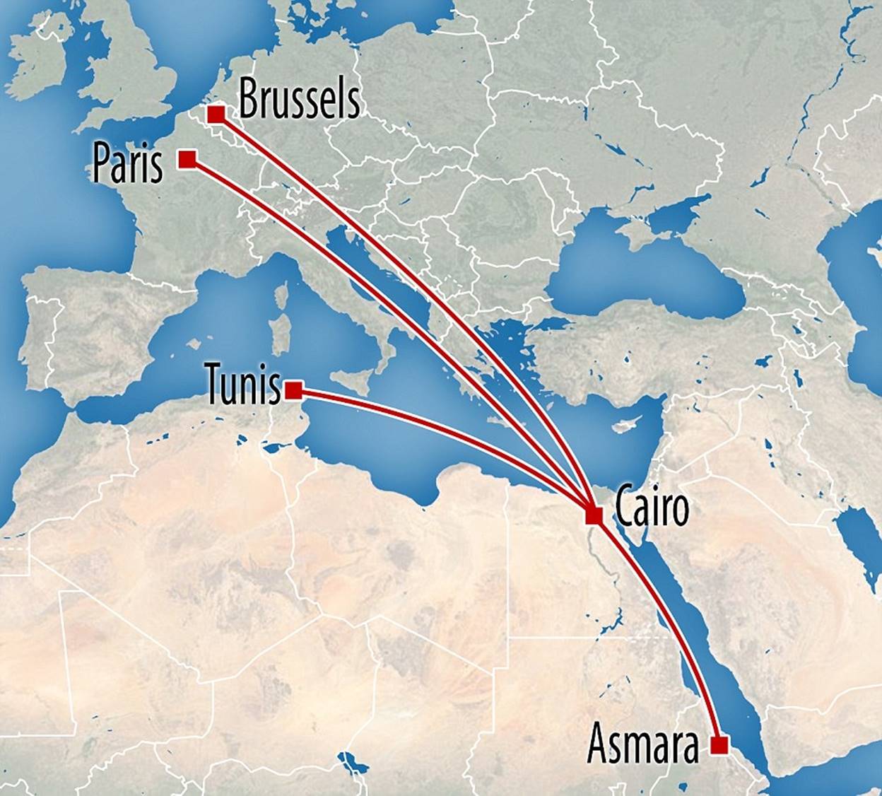 Internet site FlightRadar24 indicates the jet travelled to Tunis, Brussels and the Eritrean capital of Asmara in the two days before, leaving open the possibility that an explosive device could have been planted aboard prior to its arrival in France.