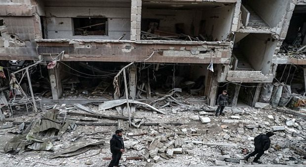 Local people attempt to clean up the rubble of damaged buildings in Ghouta, following several days of airstrikes