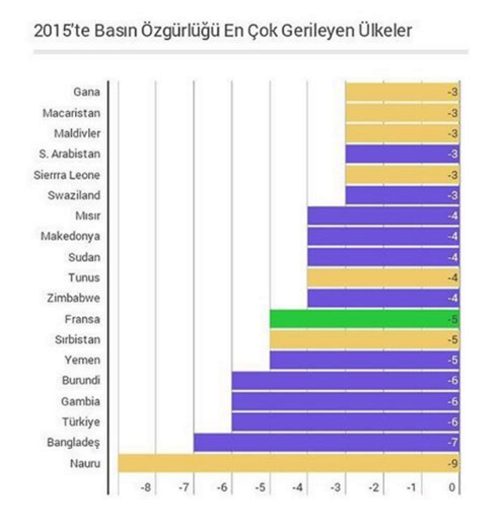Raporun “Dikkat Çeken Kazanımlar ve Kayıplar” bölümünde de Türkiye ikinci grupta yer aldı. Türkiye’de hükümetin medya üzerindeki baskısını artırmak için “gerçek ve hissedilir güvenlik tehditlerinden” yararlandığı da belirtilen raporda “Yetkililer önemli gazetecileri tutuklamak, internet medyasını sansürlemek ve Kürt ayaklanması, Suriye’deki çatışma ya da Gülen Hareketi ile bağlantılı yabancı muhabirleri sınır dışı etmek için terör bağlantılı yasaları kullanmaya devam etti” denildi.