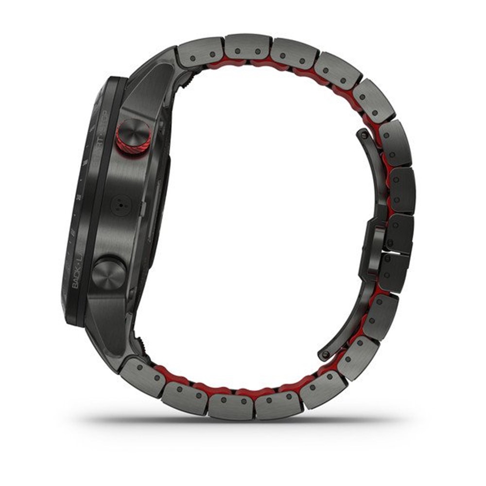 Seramik çerçeveli 46 mm elmas benzeri karbon (DLC) kaplı titanyum artı DLC kaplı titanyum kasa ve kırmızı silikon bağlantılı ve kelebek tokalı QuickFit ® bileziği ile adrenaline olan bağlılığınızı gösterin