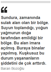 “Sundura, zamanında sulak alan olan bir bölge. Suyun toplandığı, yoğun yağmurun doğa tarafından emildiği bir bölge. Bu alan imara açılmış. Buraya binalar yapılmış. Kuşkusuz bu durum yaşananların şiddetini de çok arttırdı.”