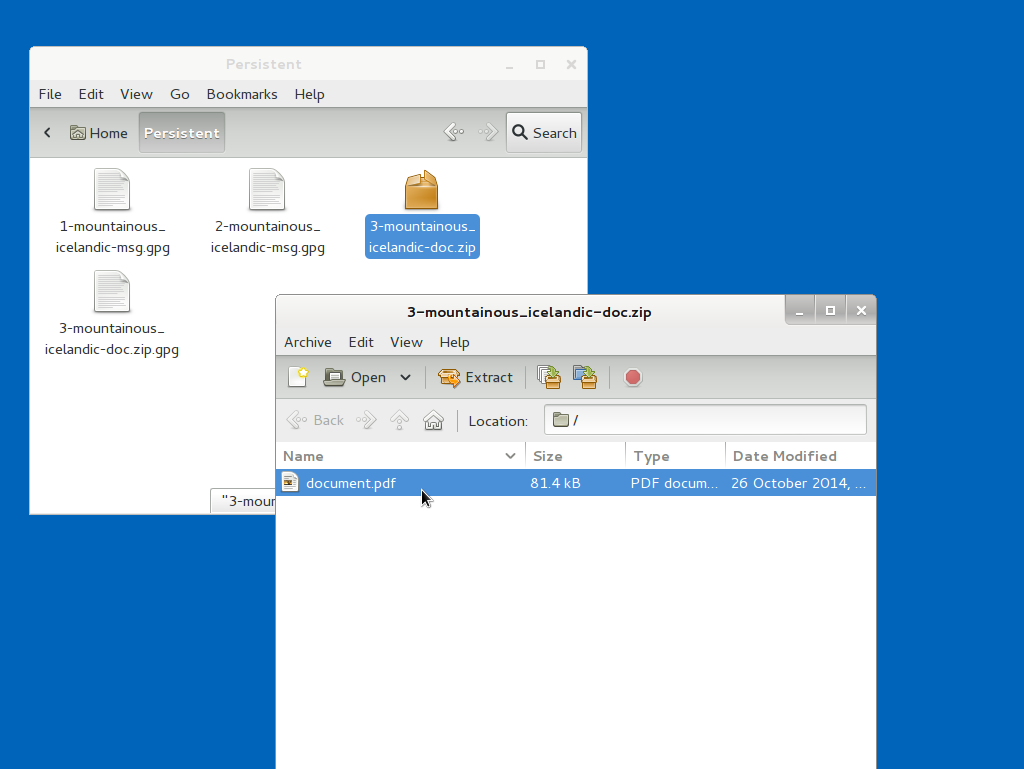 To decrypt documents, return to your Persistent folder and double-click on zipped file folder. After you extract the files, click on each file individually, and it will prompt you for the application PGP key passphrase to decrypt the document.