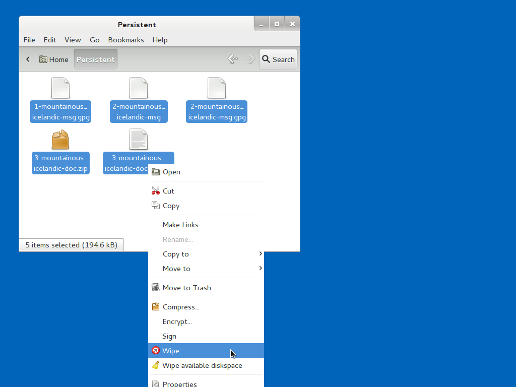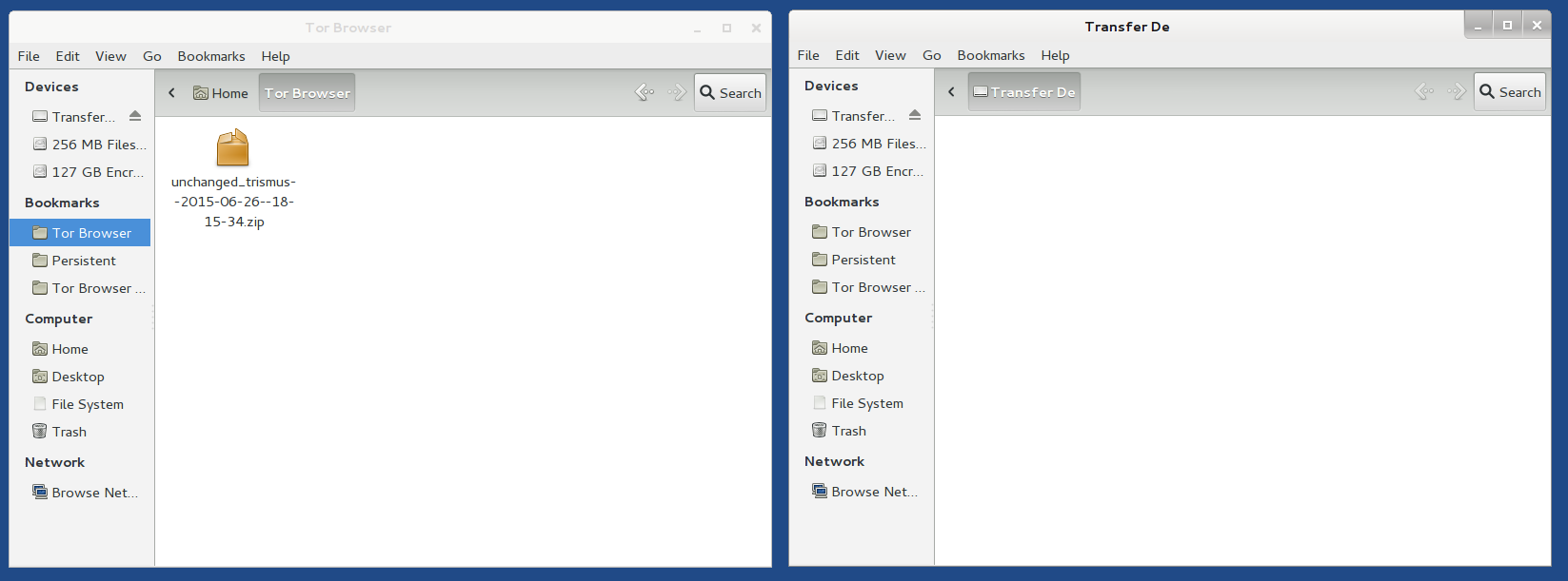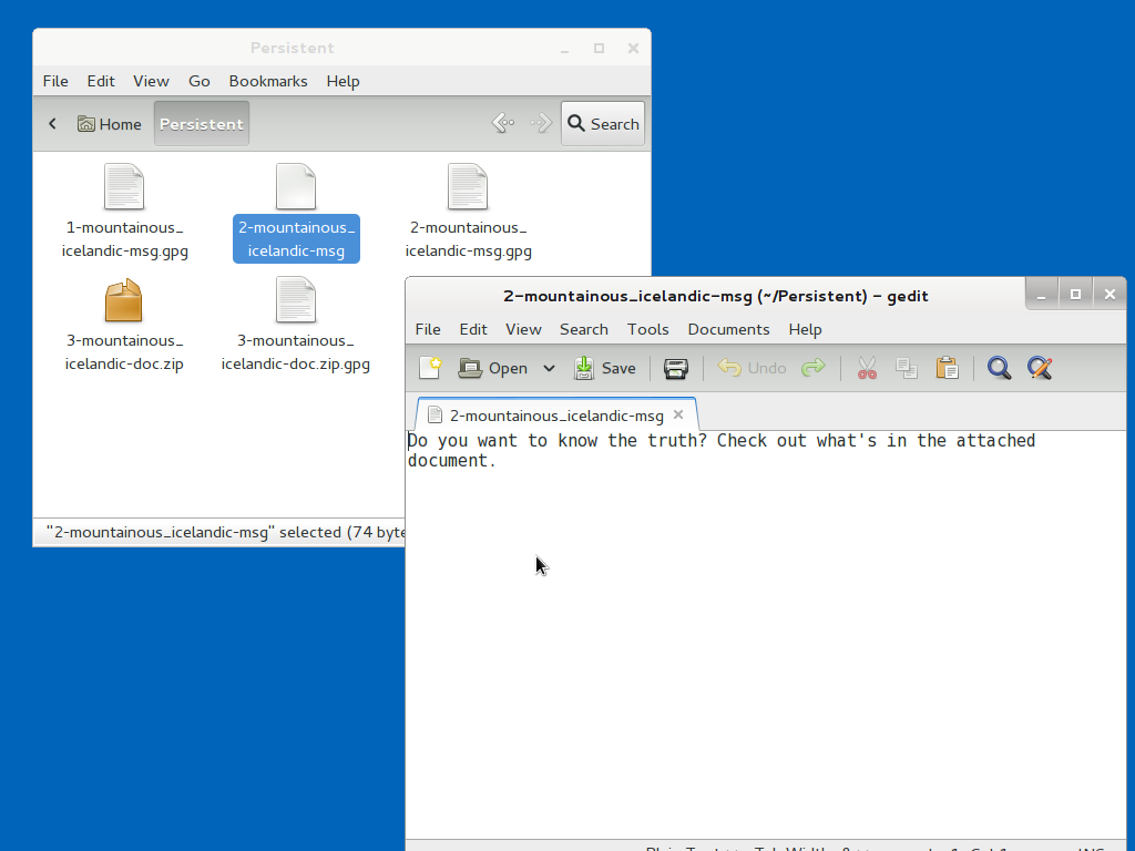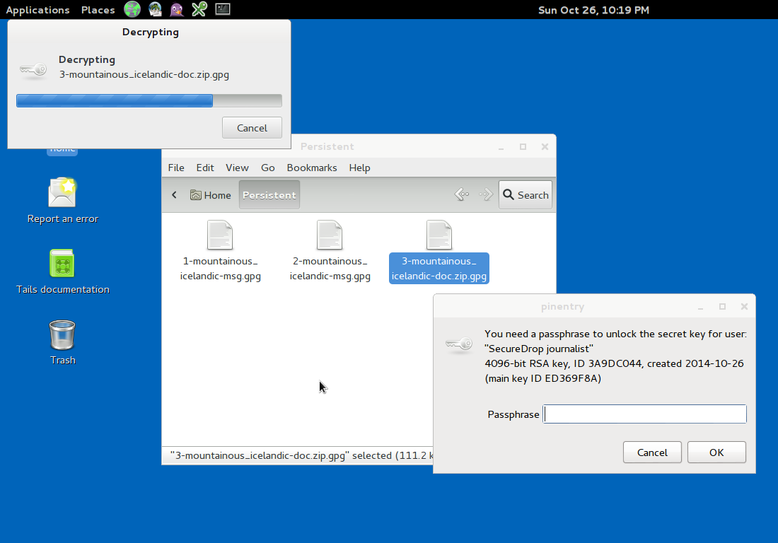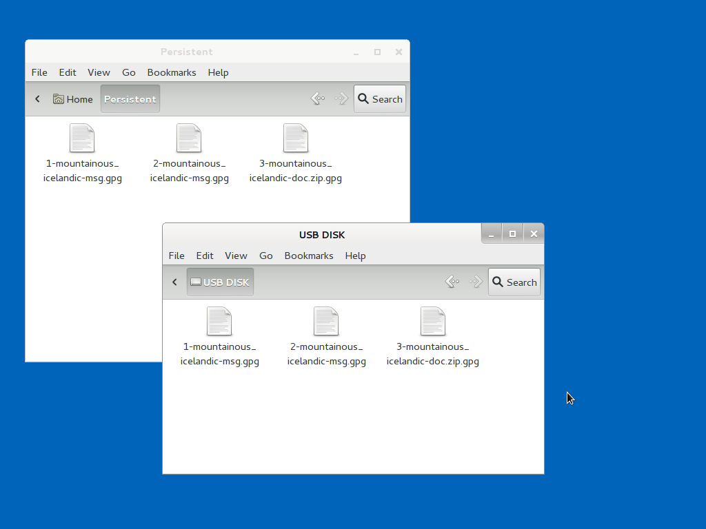 Copy these documents to the Persistent folder before decrypting them. This an important step. Otherwise you might accidentally decrypt the documents on the USB stick, and they could be recoverable in the future. You can do this by clicking on the Computer icon on your desk top, clicking on the Transfer Device, and then you can drag and drop the file into your Persistent folder.