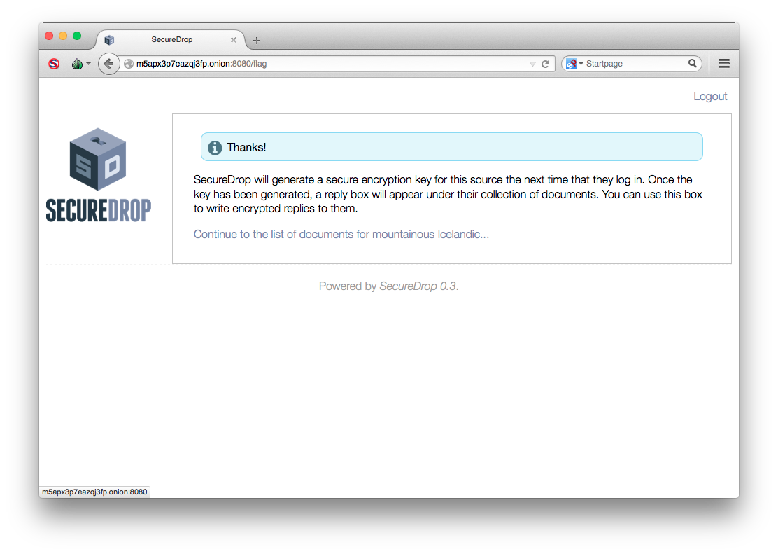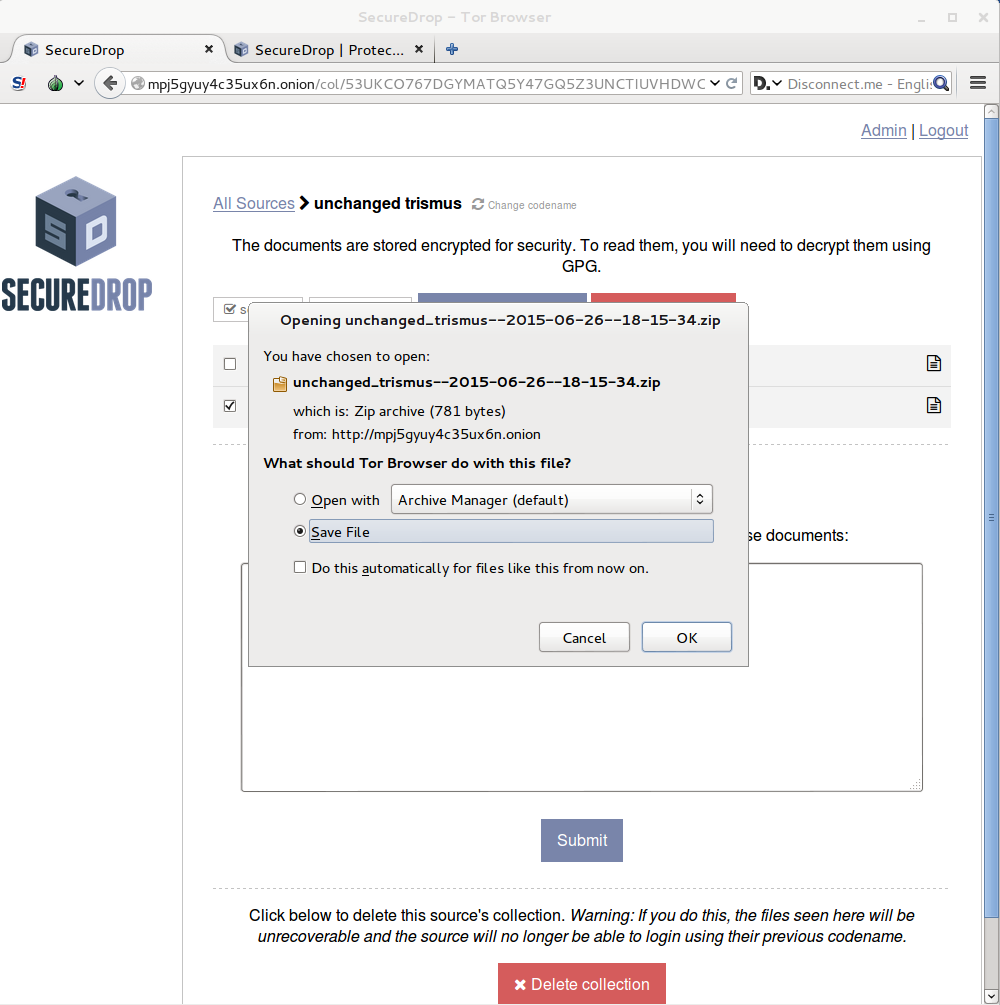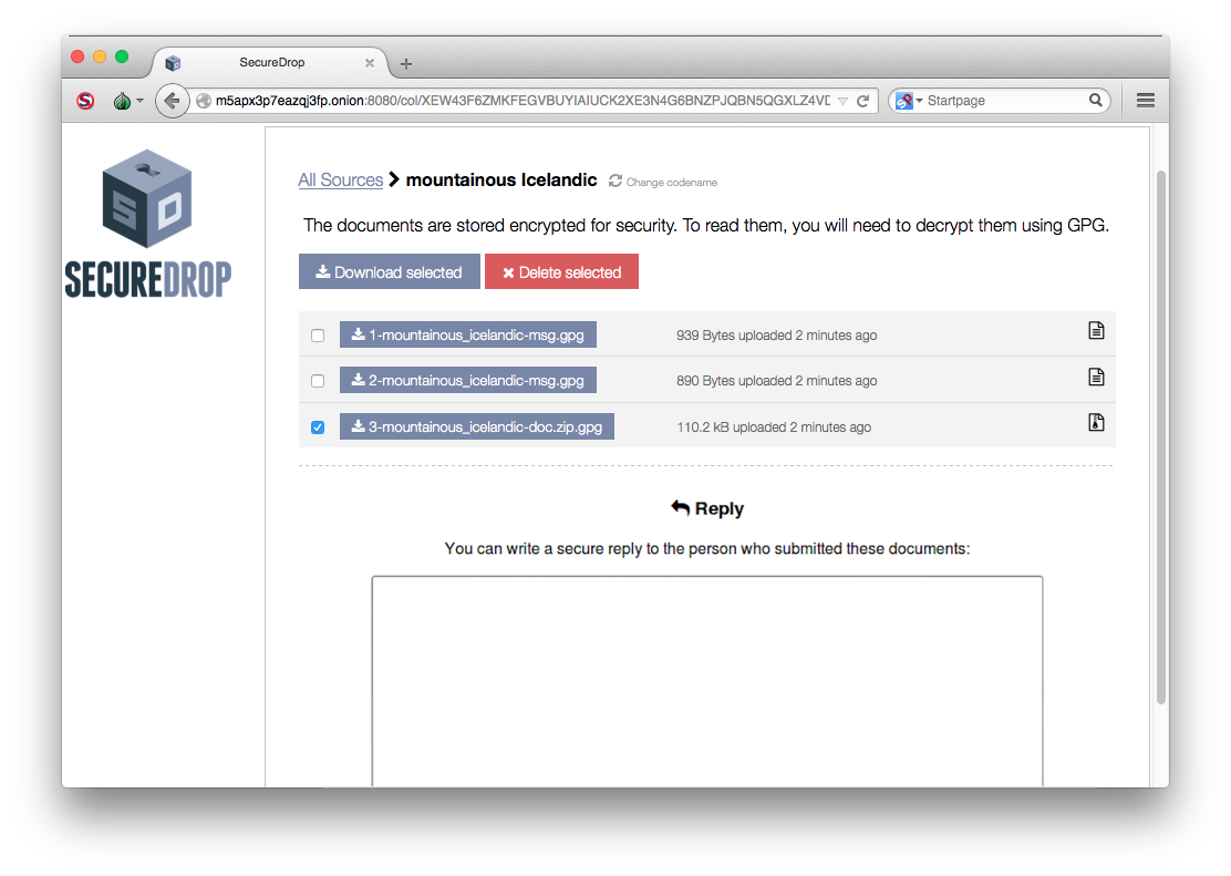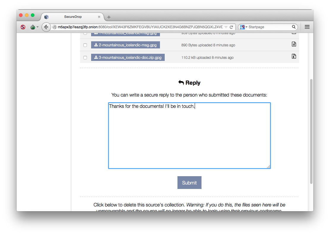 Click on the codename to see the page specifically for that source. You will see all of the messages that they have written and documents that they have uploaded. Documents and messages are encrypted to the application’s GPG public key. In order to read the messages or look at the documents you will need to transfer them to the Secure Viewing Station. But first, if you’d like to reply to the source, write your message in the text field and click Submit.