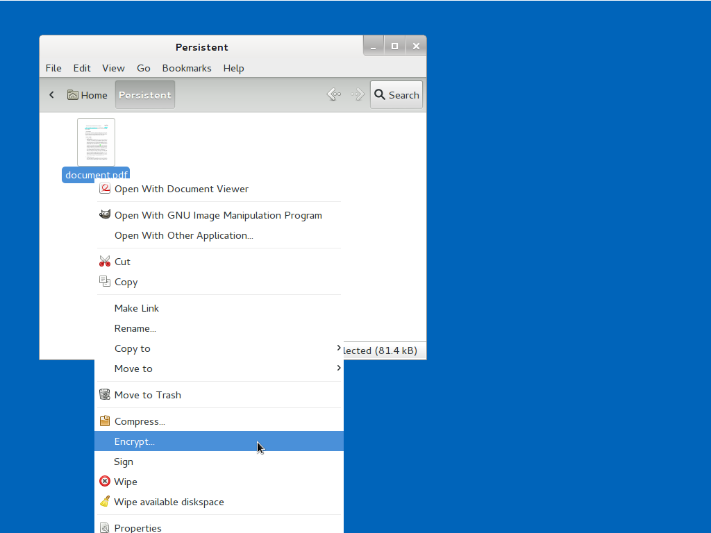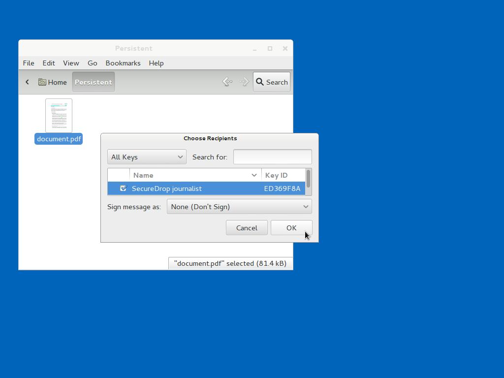 When you are done you will have another document with the same filename but ending in .gpg that is encrypted to the GPG keys you selected. You can copy the encrypted documents to the Transfer Device to transfer them to your workstation.