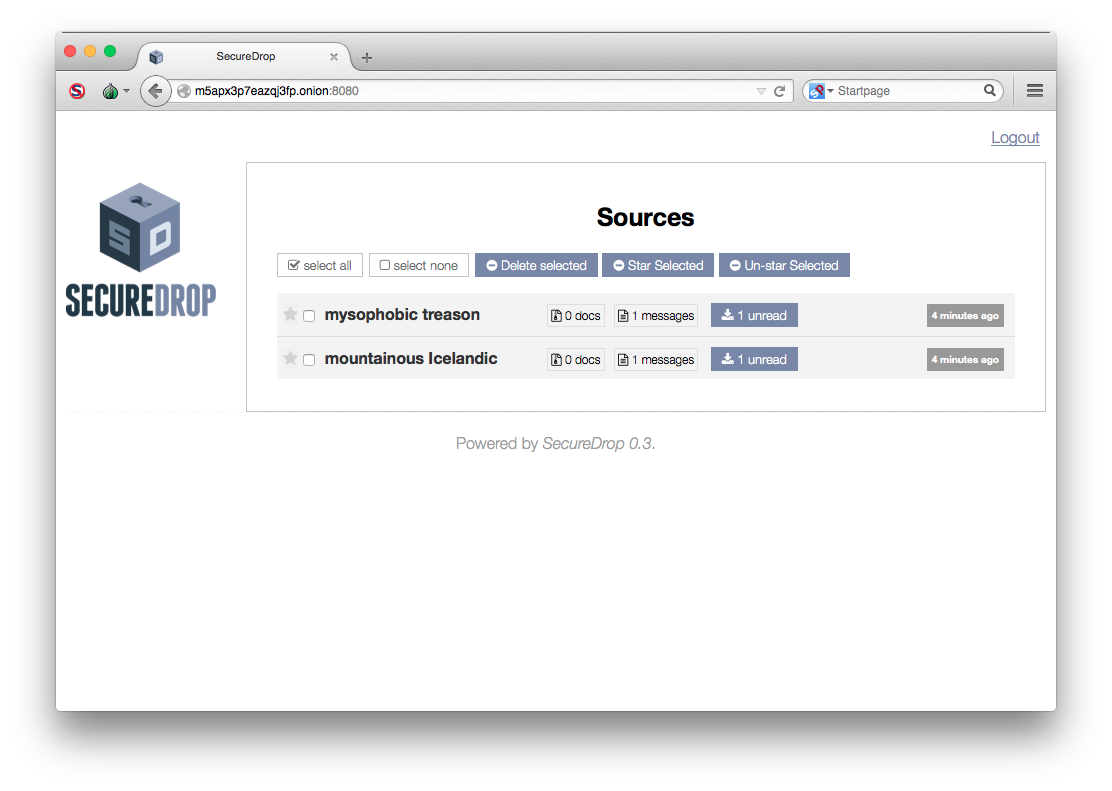 If any sources have uploaded documents or sent you message, they will be listed on the homepage by a codename. Note: The codename the journalists see is different than the codename that sources see.