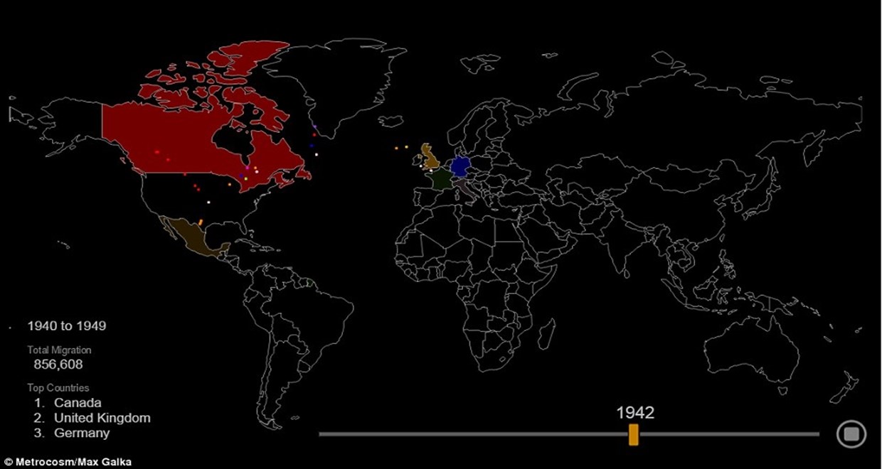It uses different colours for each country as well as brightness to illustrate the total migration at any given time, shown by the timeline at the bottom of the map.