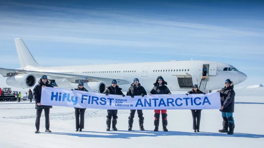 This is the incredible moment a pilot became the first to land an Airbus A340 on Antartica.