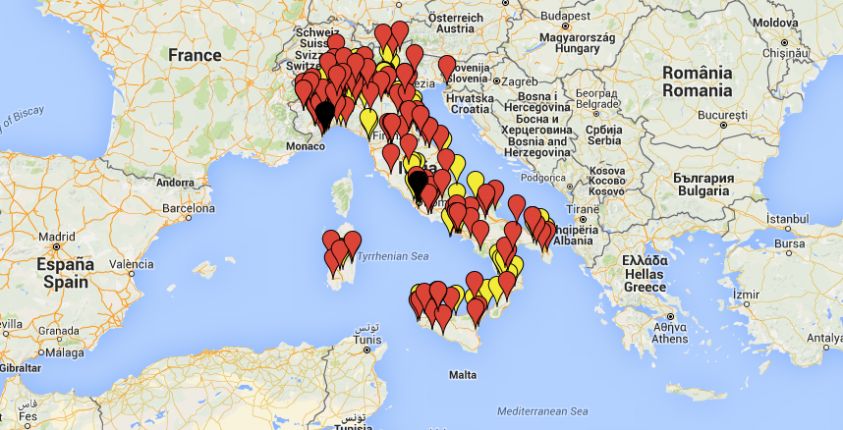 Taciz kurbanları tarafından kurulan ve pedofili vakalarının yargıya taşınması için mücadele eden “L’Abuso” (taciz) isimli dernek tarafından hazırlanan harita, İtalya’da son 10 yılda yapılan şikayetleri ve bunların sonuçlarını gösteriyor.
