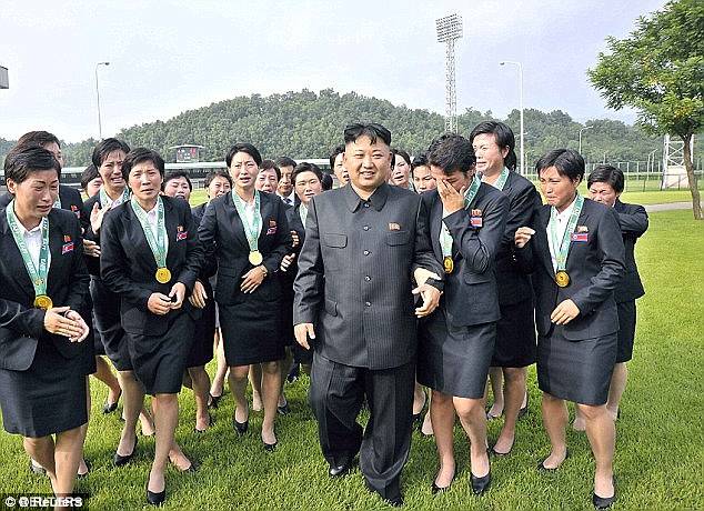Mobbed: Kim Jong-un smiles as he walks alongside members of North Korea’s women’s national soccer team