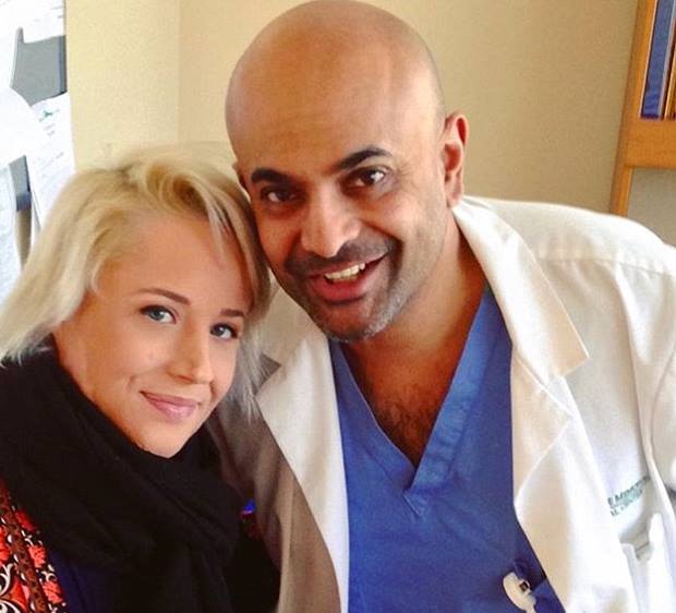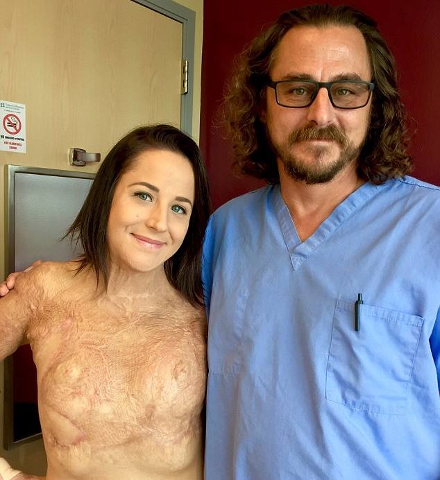 Stefanie has had multiple skin grafts, skin expanders, Z-plasty, a plastic surgery technique that is used to improve the appearance of scars, reconstructive and release surgeries to loosen scar bands. She has been having laser treatments every six weeks. Pictured with Dr Vimal K Murphy, the doctor who saved her life