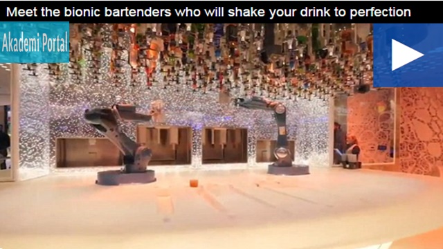 Customers order cocktails, from either a set a menu or by designing their own concoction, and the order is sent to a pair of single-armed robots attached to a makeshift ‘bar’.