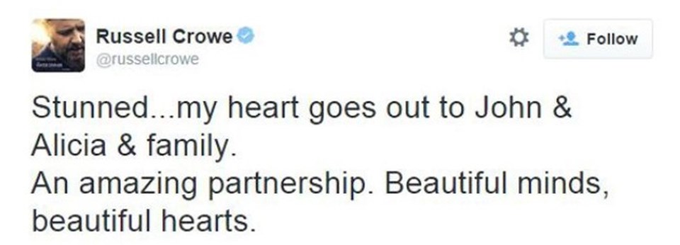 Russell Crowe, Twitter’dan paylaştığı mesajda “Şoktayım… Kalbim John & Alicia & aileleriyle. Muhteşem bir işbirliğimiz olmuştu. Güzel akıllar, güzel kalpler” cümlelerine yer verdi.