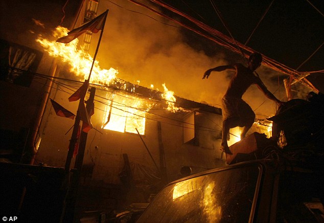 A group of young boys were forced to run through a back alley as fire spread through a residential area in Manila