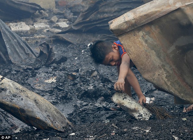 A boy retrieves some items following an early morning fire that engulfed the poor neighborhood of Tondo while residents celebrated the New Year