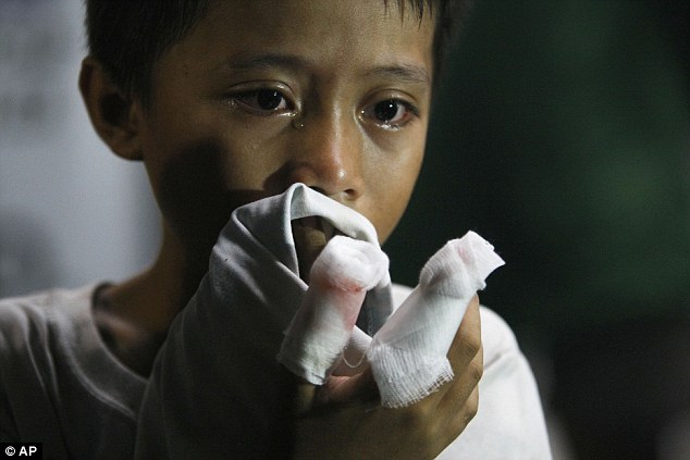 Firecracker victims – including this young boy – were rushed into emergency rooms grimacing in pain as they held their bloodied limbs