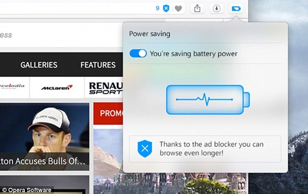 Opera’s new browser for laptops has a power saving mode (pictured) that it claims can cut the battery drain by up to 50 per cent compared to earlier versions of the software and competitors like Google Chrome